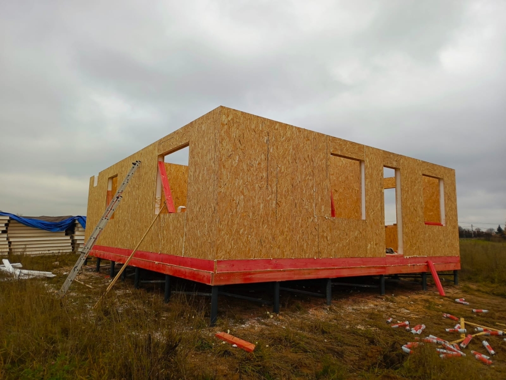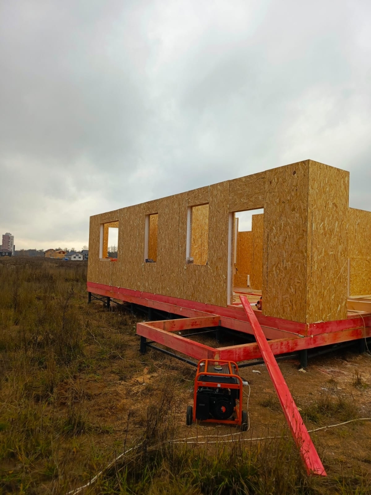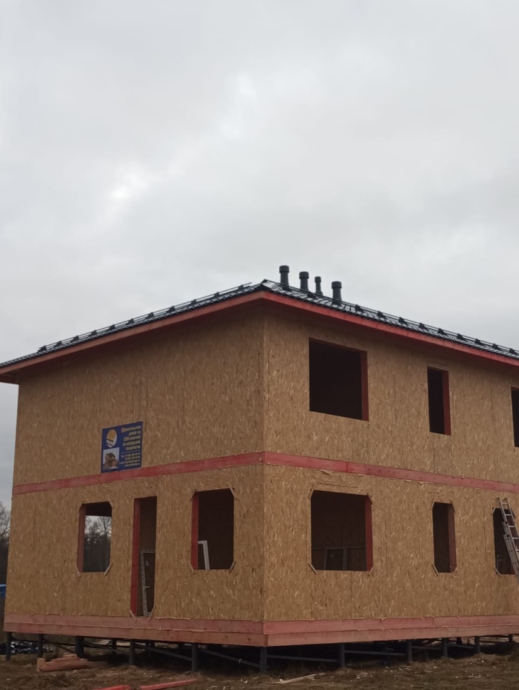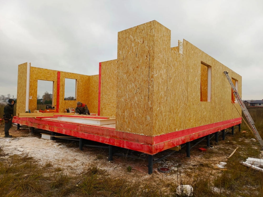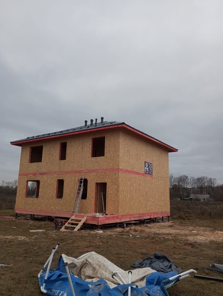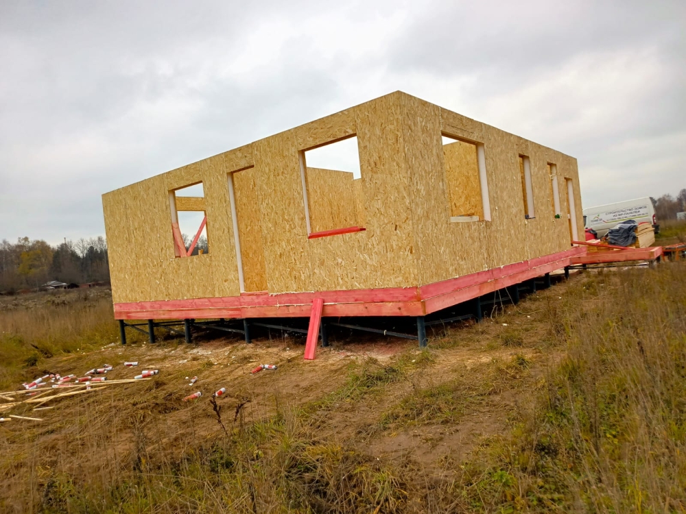 - Возводим наружные стены 1 и 2 этажа дома — СИП панели, толщина стен 174 мм, высота 2800 мм.