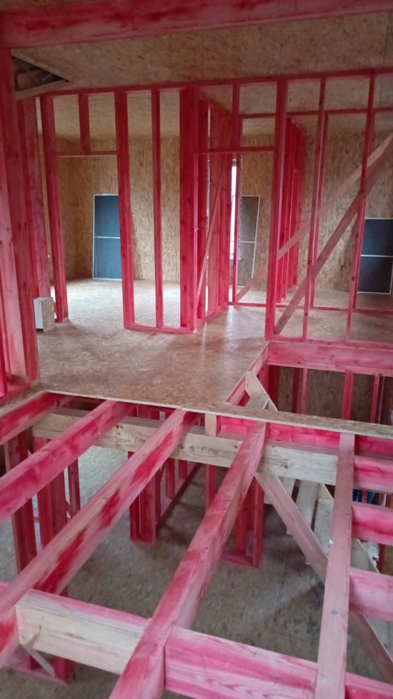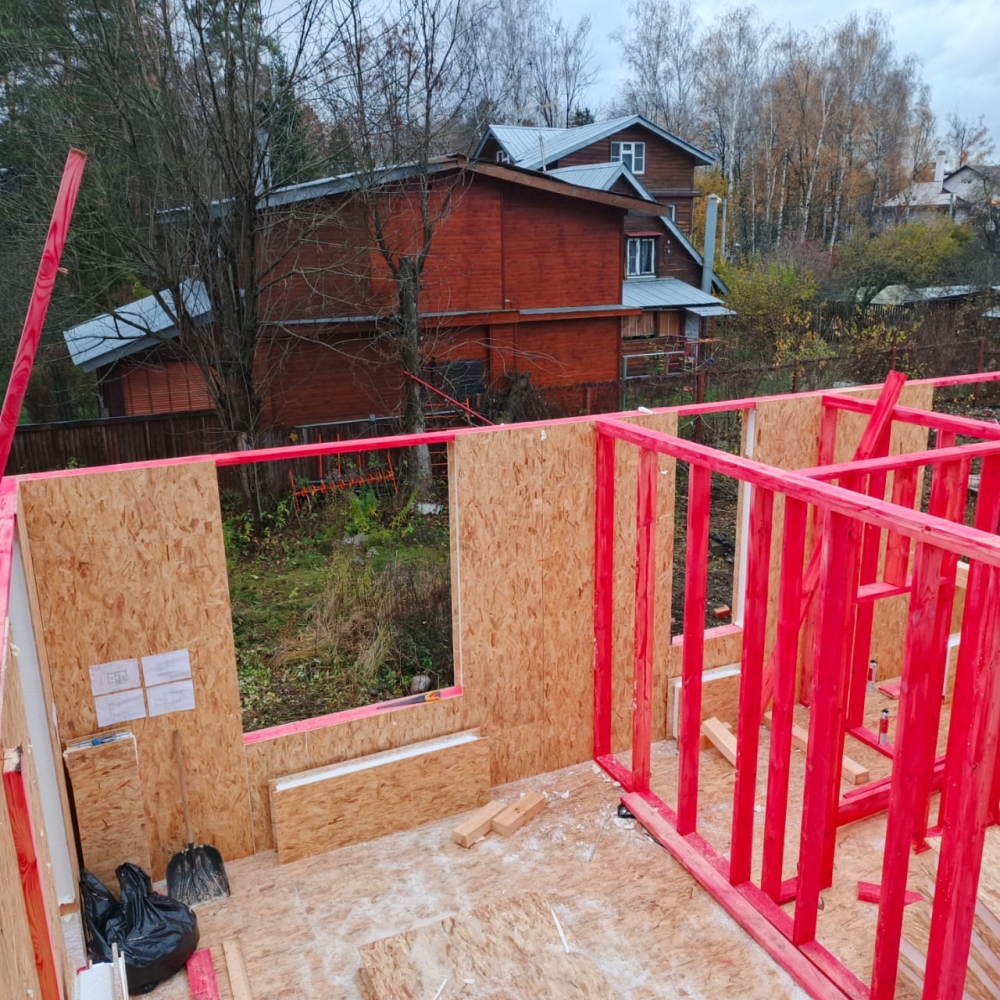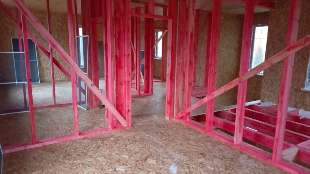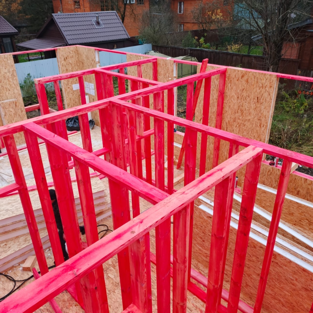 - Возводим внутренние стены 2 этажа дома — каркас из пиломатериала 145 мм.