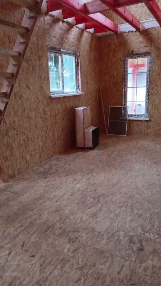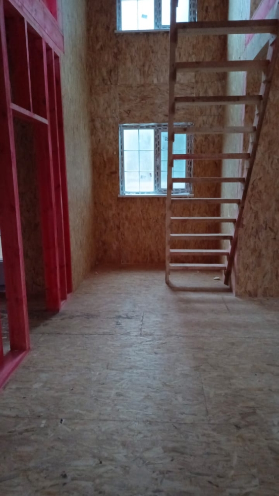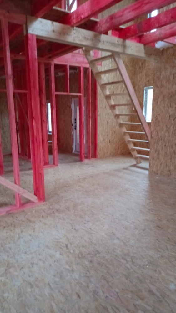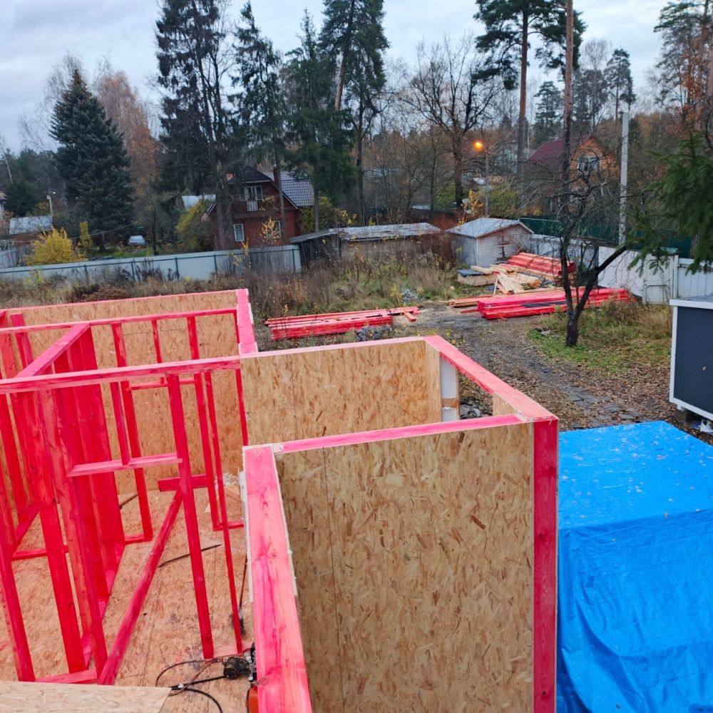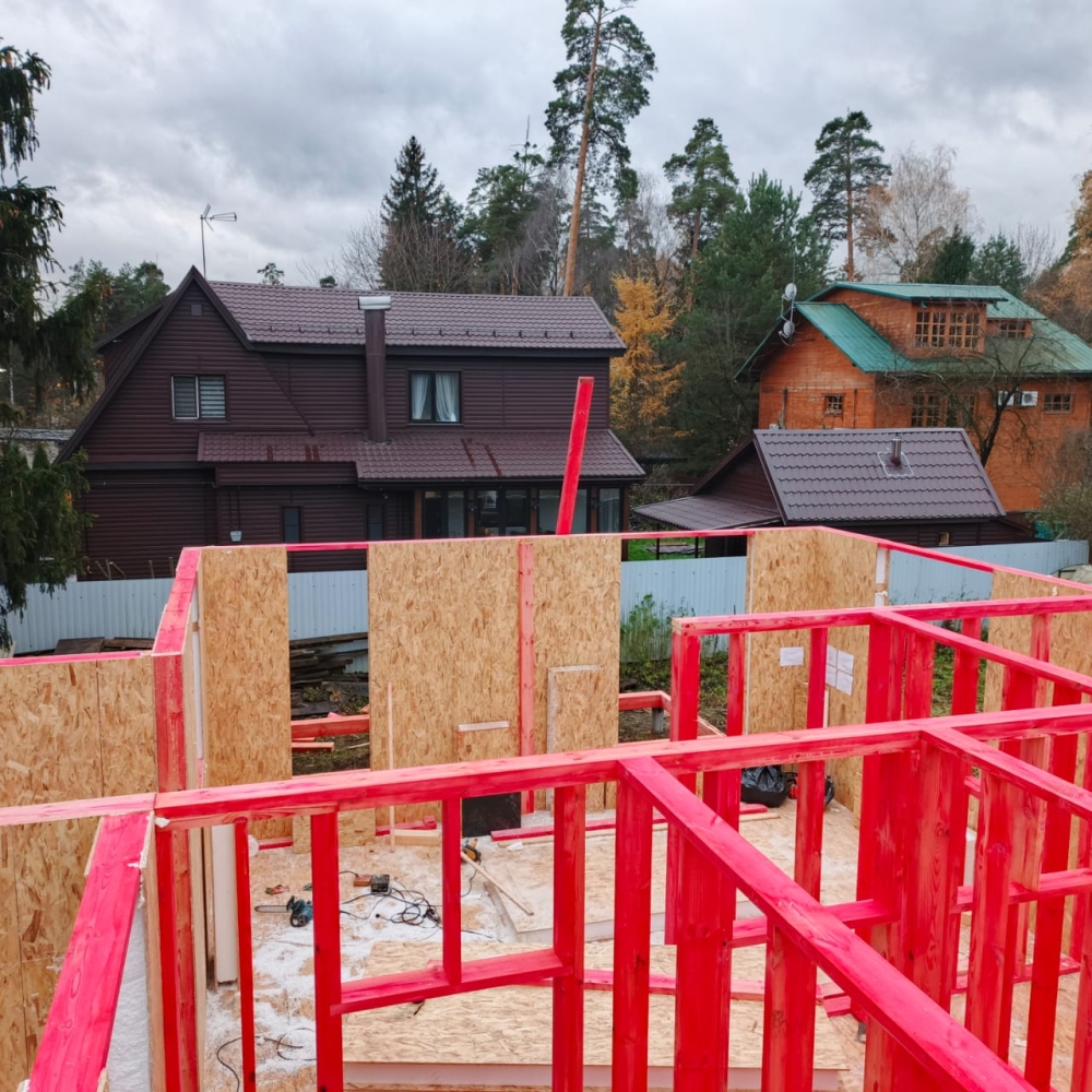 - Возводим внутренние стены 2 этажа дома — каркас из пиломатериала 145 мм.