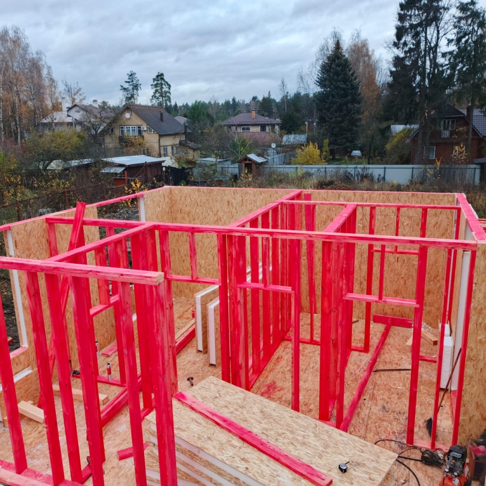 - Возводим внутренние стены 1 этажа дома — каркас из пиломатериала 145 мм.
