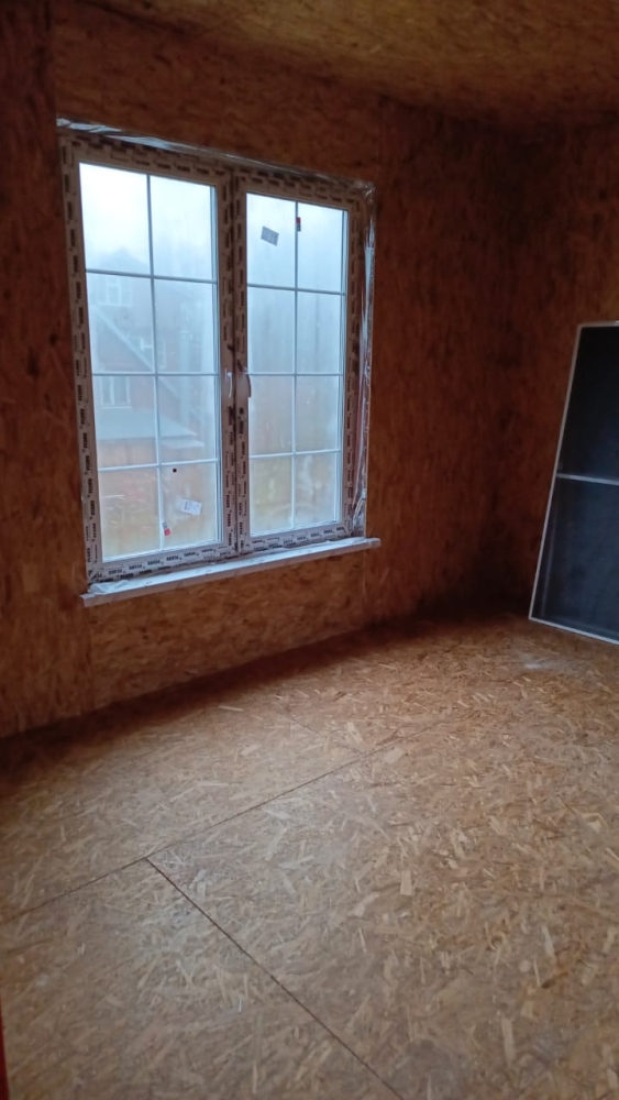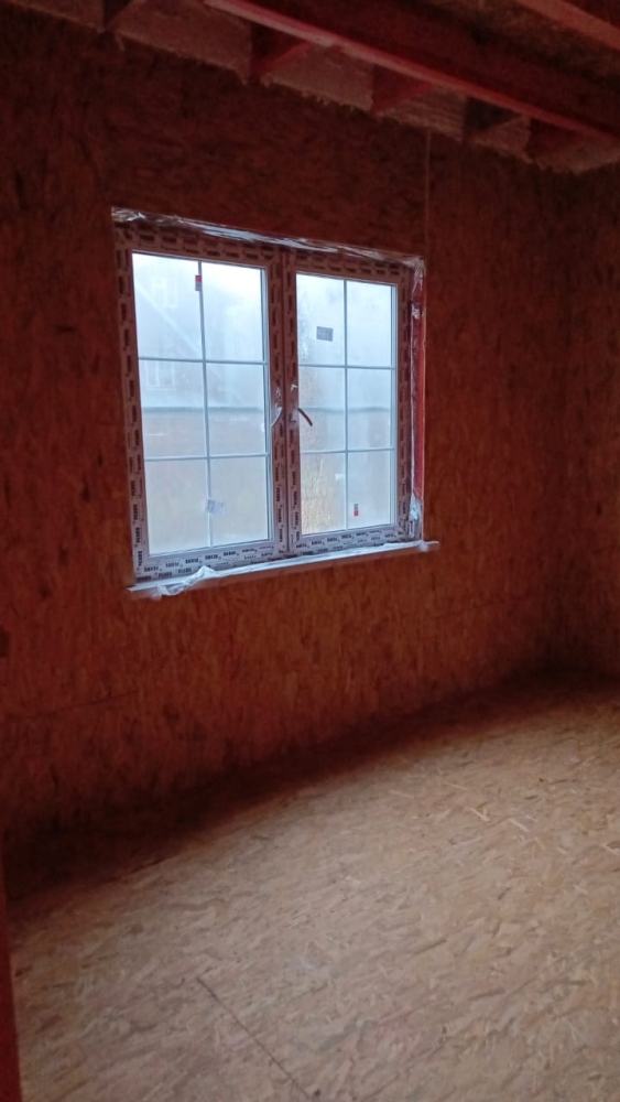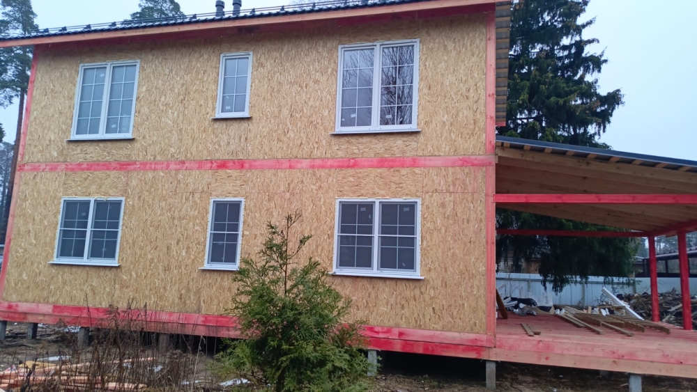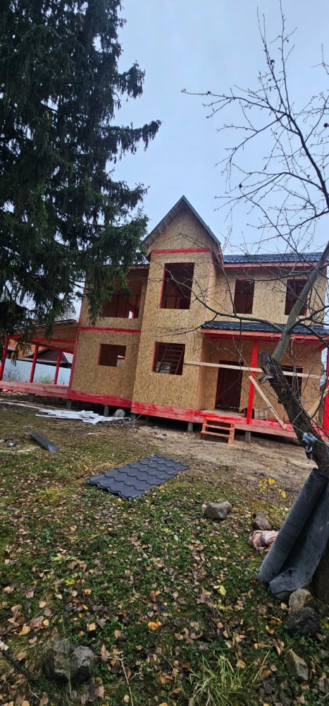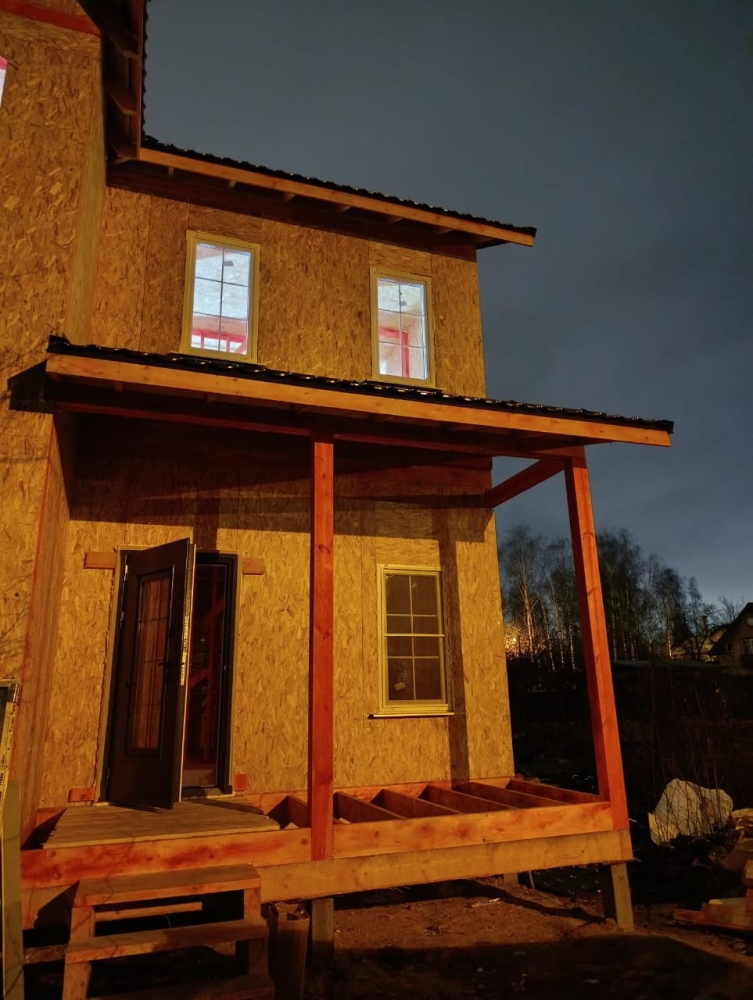 - Возводим наружные стены 2 этажа дома — СИП панели, толщина стен 174 мм, высота 2800 мм.