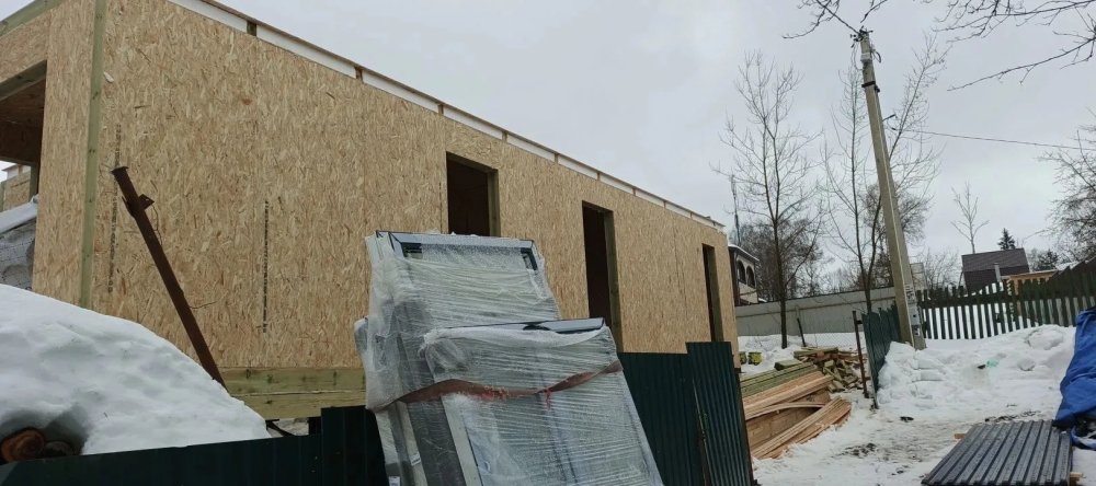 - Возводим наружные стены 1 этажа дома — СИП панели, толщина стен 174 мм, высота 2800 мм.