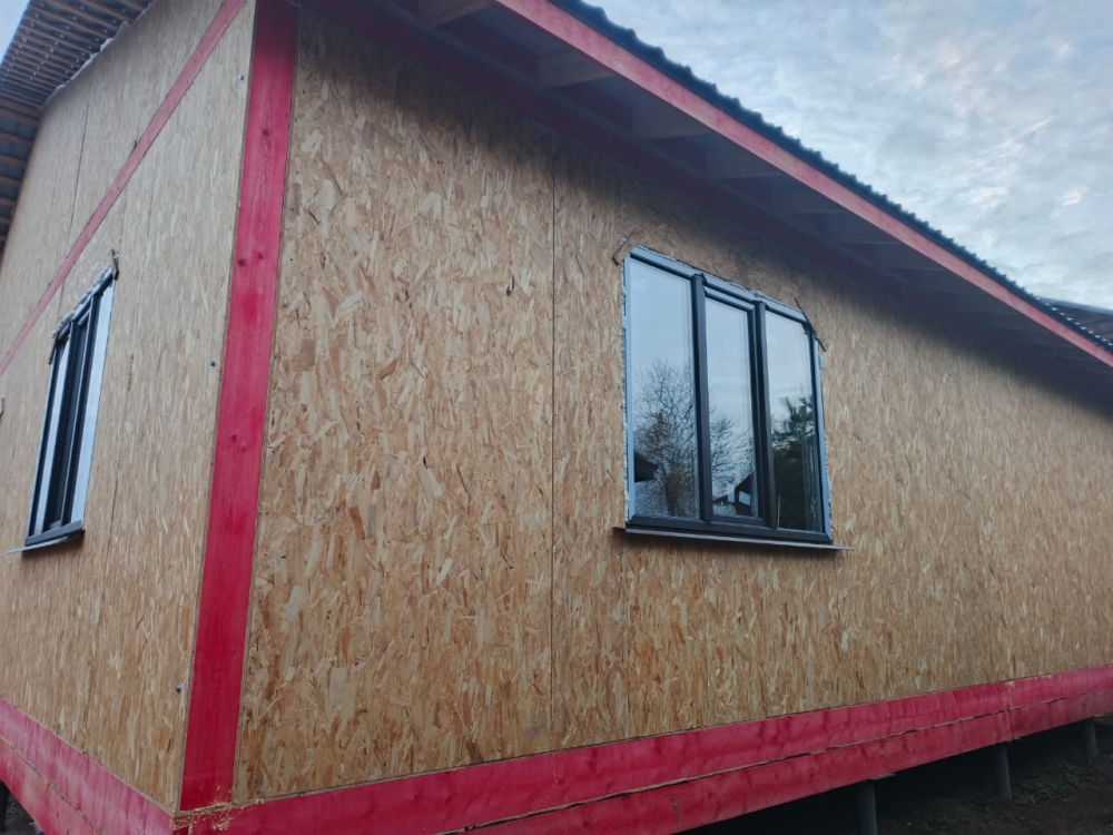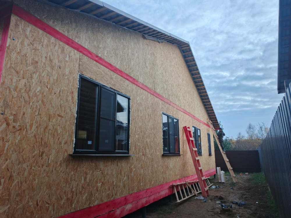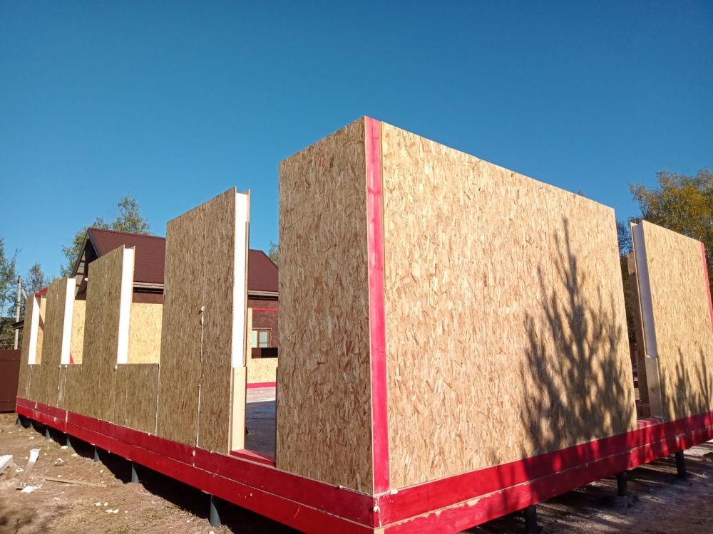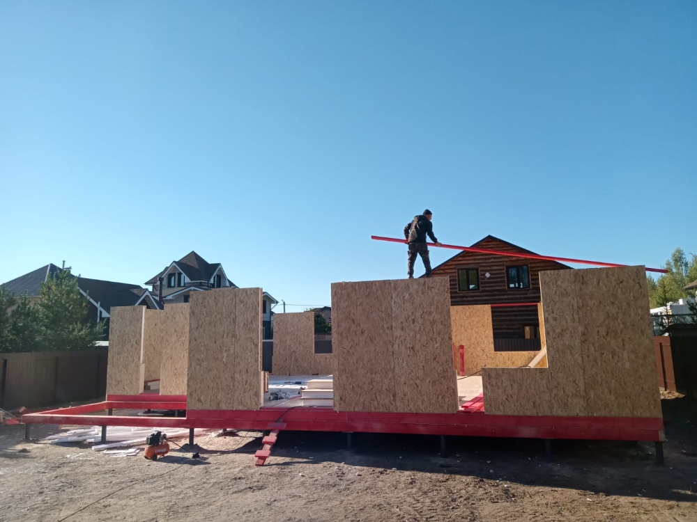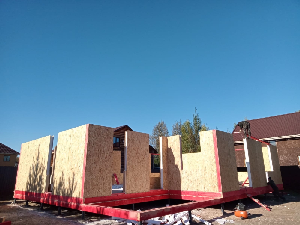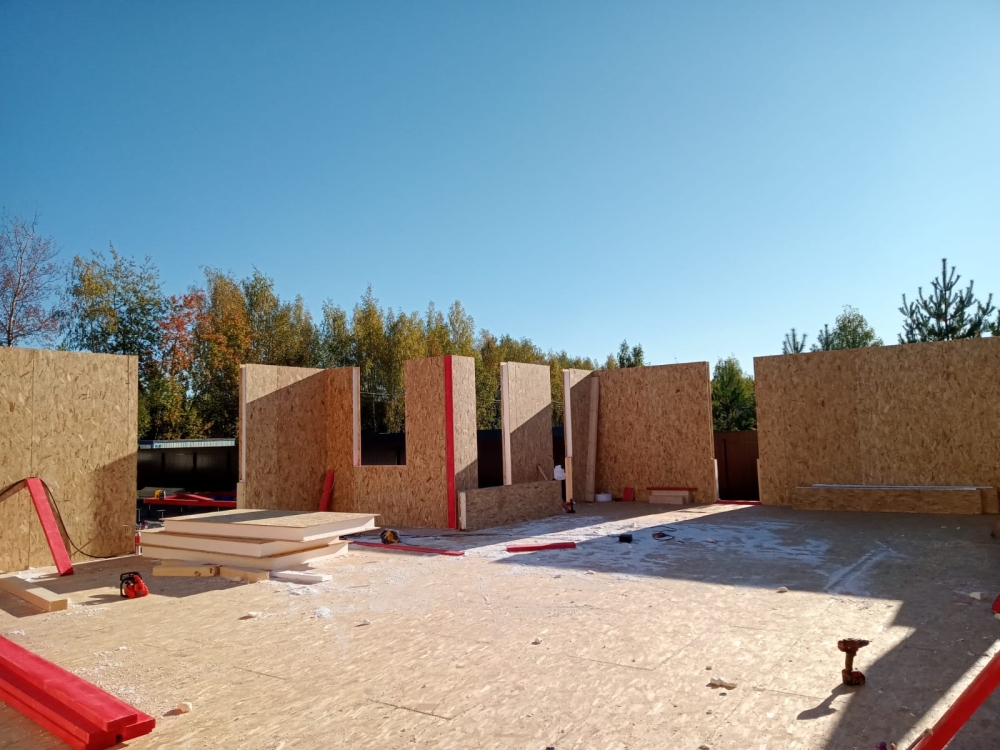 - Возводим наружные стены 1 этажа дома — СИП панели, толщина стен 174 мм, высота 2800 мм.