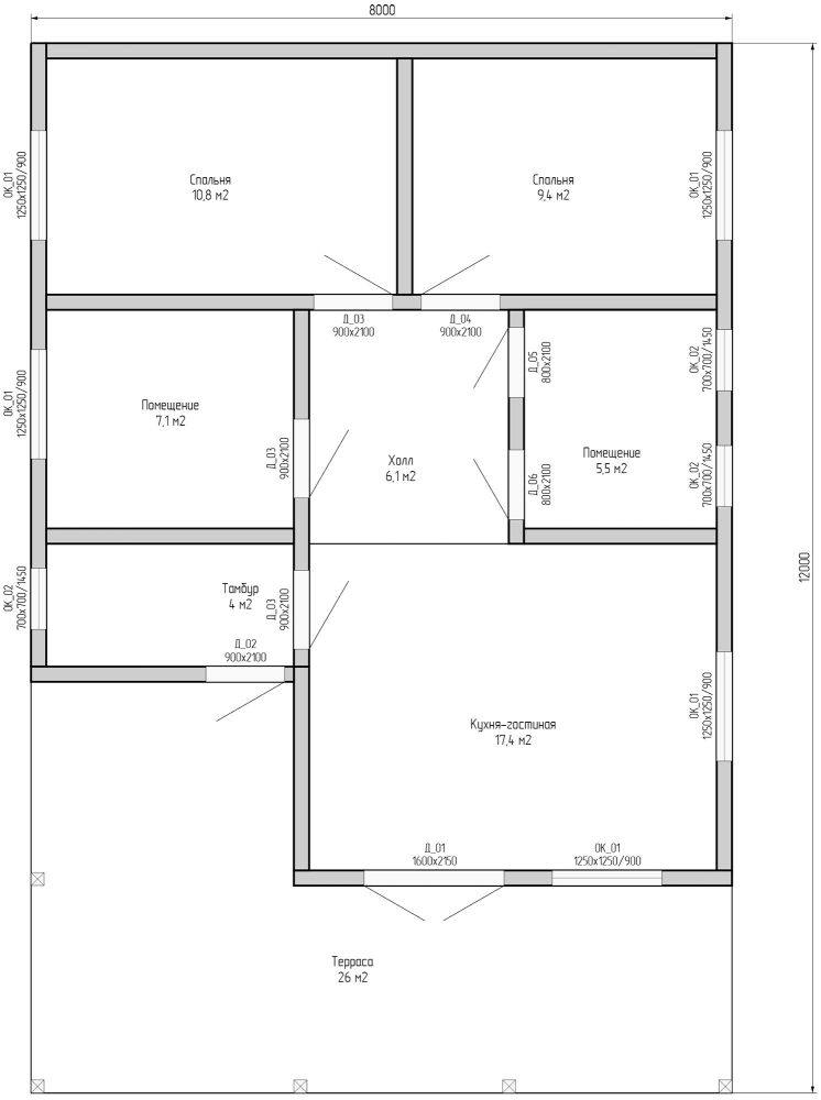 - Размеры дома по тепловому контуру - 8х9,6 м + терраса 26 м².
