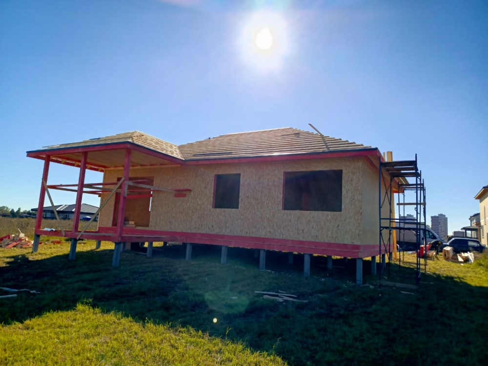 - Возводим наружные и внутренние стены 1 этажа дома — СИП панели, толщина стен 174 мм, высота 2800 мм.