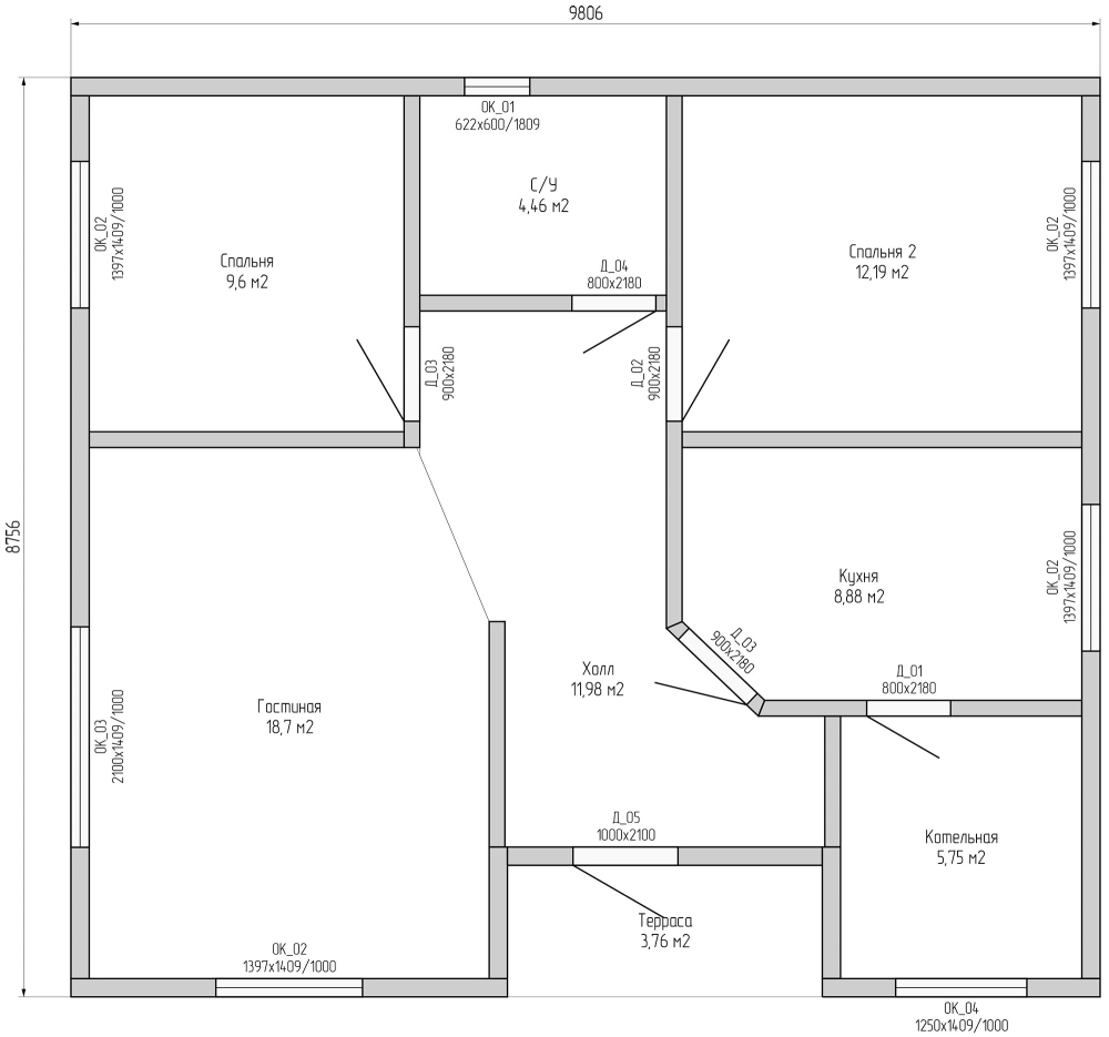 - Размеры дома по тепловому контуру - 9,8х8,7 м.
