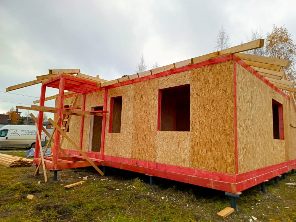 - Возводим наружные стены 1 этажа дома — СИП панели, толщина стен 174 мм, высота 2800 мм.