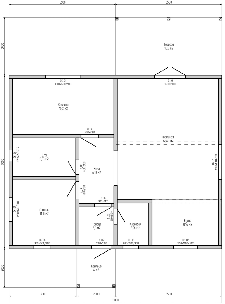 - Размеры дома по тепловому контуру - 11х9 м + терраса 16,5 м².